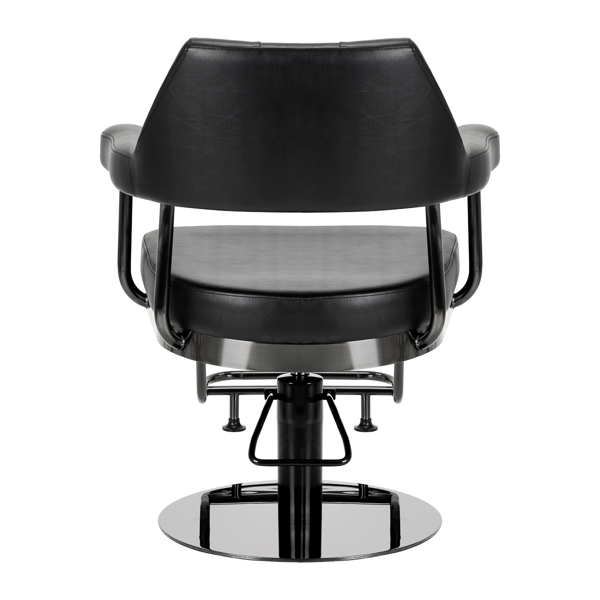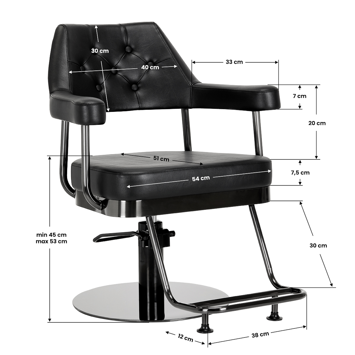 Trwały podnośnik hydrauliczny pozwala na regulację poziomu siedziska w granicach 45-53 cm, nawet w momencie, kiedy klient siedzi na fotelu. Gwarantuje to bardziej ergonomiczną pracę, dzięki możliwości swobodnego dostosowania wysokości do wzrostu zarówno klienta, jak i fryzjera. Wyprofilowane oparcie, ozdobione pikowaniem z dobranymi guzikami, pozwala na zajęcie dogodnej pozycji. Zapewnia to odpowiednie wsparcie dla pleców, co ma znaczenie zwłaszcza w przypadku zabiegów trwających wiele godzin. Dużym plusem, a przy tym ciekawym wizualnie elementem, jest tutaj finezyjny otwór pomiędzy oparciem i siedziskiem. Ułatwia on zachowanie czystości w salonie, pozwala z łatwością wymieść włosy z każdego zakamarka fotela, oszczędzając przy tym czas przygotowania stanowiska pracy pomiędzy klientami.
