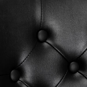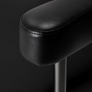 Fotel wypełniony jest pianką, która jest trwała i nie odkształca się, zapewniając komfortowe użytkowanie przez długi czas. Obicie wykonane jest z przyjemnej w dotyku imitacji skóry o specyficznej strukturze. Dzięki użyciu takiego materiału, sprzęt jest odporny na wilgoć, wytrzymały i łatwy w czyszczeniu. Pokrycie w odcieniach czerni oraz ozdobne elementy w barwach czerni nadają mu wyraz ponadczasowej elegancji. Wyróżnia go gustowne wykończenie, które nadaje mu ekskluzywny charakter i sprawia, że będzie doskonale prezentować się w wielu profesjonalnych salonach.