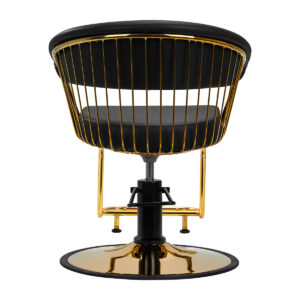 Trwały podnośnik hydrauliczny pozwala na regulację wysokości siedziska w granicach 48-55 cm, nawet w momencie, kiedy klient siedzi na fotelu. Gwarantuje to bardziej ergonomiczną pracę, dzięki możliwości swobodnego dostosowania poziomu fotela do wzrostu zarówno klienta, jak i fryzjera oraz opcji pełnego obrotu. Doskonale wyprofilowane oparcie obite skórą syntetyczną pozwala na zajęcie dogodnej pozycji. Zapewnia to odpowiednie wsparcie dla pleców, co ma znaczenie zwłaszcza w przypadku zabiegów trwających wiele godzin. Ciekawym wizualnie elementem jest tutaj metalowy, polerowany finezyjny detal w odcieniach złota łączący oparcie z siedziskiem. Powstałe przestrzenie ułatwiają zachowanie czystości w salonie, pozwalając łatwo wymieść włosy z każdego zakamarka fotela. Oszczędza się w ten sposób czas przygotowania stanowiska pracy pomiędzy klientami.