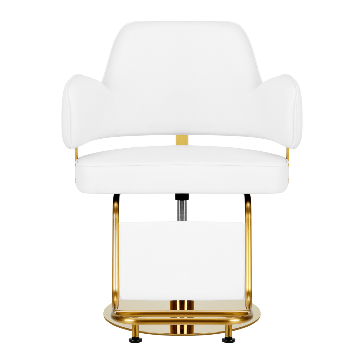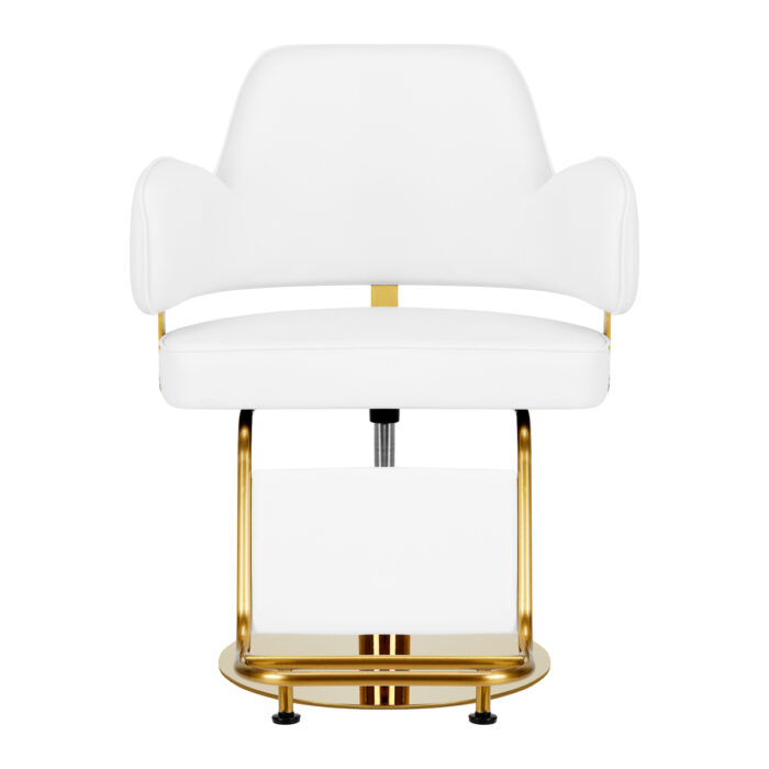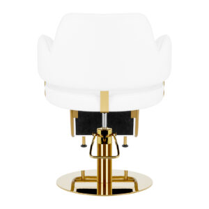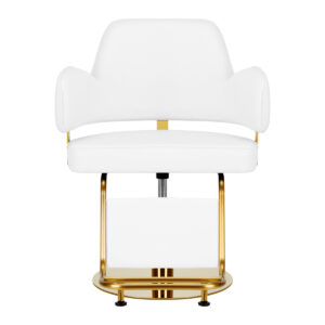 Wygodny mebel wypełniony jest trwałą, odporną na odkształcenia pianką, z kolei obicie wykonane jest z przyjemnej w dotyku skóry syntetycznej. Zastosowane materiały zapewniają komfortowe użytkowanie mebla przez długi czas i sprawiają, że sprzęt jest odporny na wilgoć, wytrzymały oraz łatwy do czyszczenia. Pokrycie w odcieniach bieli oraz ozdobne elementy w barwach złota nadają mu wyraz ponadczasowej elegancji. Fotel fryzjerski Gabbiano Linz NQ wyróżnia minimalistyczny design, który nadaje mu wyjątkowy charakter i sprawia, że fotel będzie doskonale prezentować się w wielu eleganckich salonach.