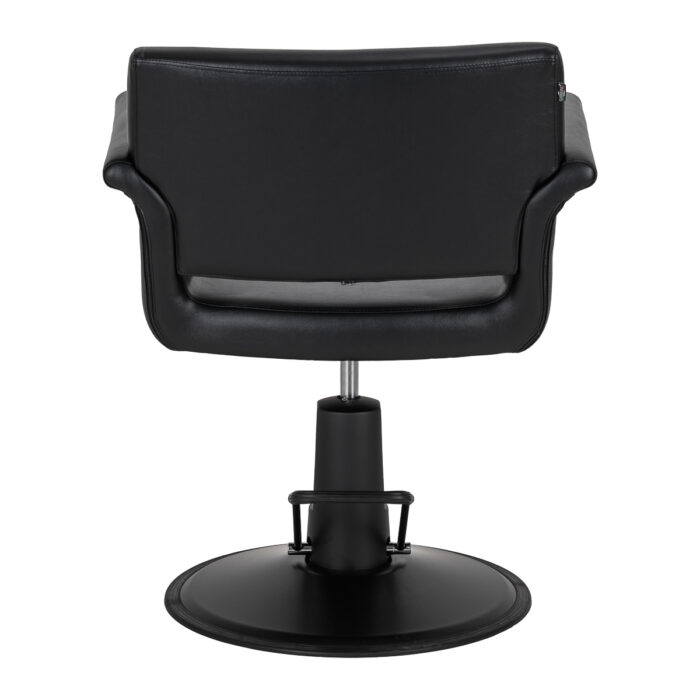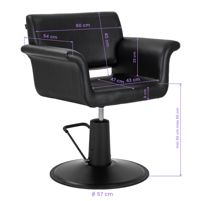 Solidny podnośnik hydrauliczny umożliwia płynną regulację wysokości siedziska w zakresie od 50 do 65 cm – również, gdy klient siedzi na fotelu. Dzięki temu łatwo dopasować pozycję do wzrostu zarówno klienta, jak i stylisty, co sprzyja zachowaniu ergonomicznej postawy w trakcie pracy. Wygodne oparcie gwarantuje stabilne podparcie pleców, a tym samym komfort nawet podczas długich zabiegów. Mechanizm pełnego obrotu zwiększa swobodę ruchu i umożliwia bezproblemowy dostęp do klienta z każdej strony.