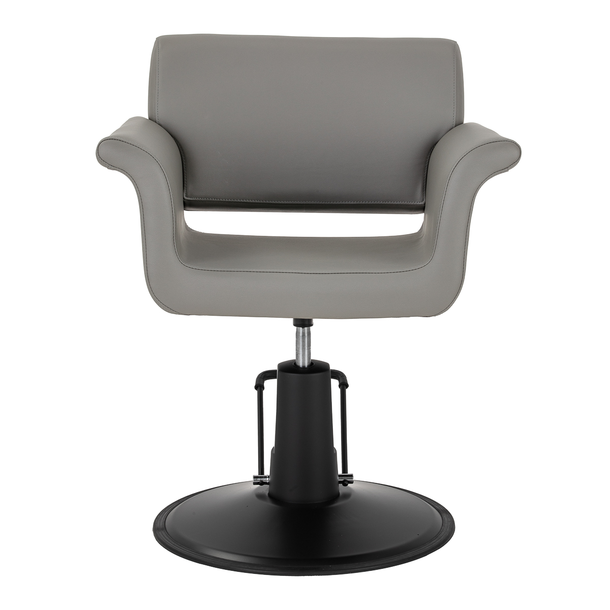 Fotel fryzjerski Gabbiano Lucca łączy nowoczesną prostotę z wygodą codziennego użytkowania. Okrągła, czarna podstawa gwarantuje stabilność, a tapicerka ze skóry syntetycznej w odcieniu szarości zapewnia komfort podczas zabiegów. Trwałe, odporne na wilgoć materiały sprawiają, że model ten jest nie tylko komfortowy, ale i wyjątkowo łatwy w pielęgnacji, dzięki czemu zachowuje estetyczny wygląd na lata. Charakterystycznie wygięte na zewnątrz podłokietniki nadają fotelowi elegancki wygląd, a jednocześnie wspierają wygodną pozycję klienta. To uniwersalny model, który doskonale wpisze się zarówno w nowoczesne, jak i bardziej klasyczne aranżacje, podkreślając profesjonalny styl salonu.