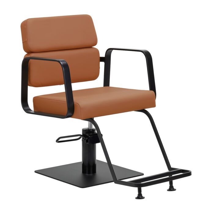 Mechanizm pełnego obrotu, w który jest wyposażony fotel, sprawia, że praca fryzjera staje się bardziej efektywna i wygodna. Solidna, płaska podstawa w kształcie kwadratu gwarantuje stabilność w trakcie użytkowania. Matowo wykończona, gładka powierzchnia nadaje elementowi elegancki wygląd i sprawia, że ten jest łatwy do utrzymania w czystości. Wygodne siedzisko z wypełnieniem z pianki zapewnia wysoki komfort użytkowania, nawet podczas wielogodzinnych zabiegów. Geometryczne, metalowe podłokietniki pozwalają na prawidłowe ułożenie barków klienta – sprawia to, że nie chowa głowy w ramionach ani się nie garbi – co wyraźnie ułatwia wykonywanie precyzyjnych zabiegów, w tym strzyżenia. Dedykowany do tego modelu stylowy podnóżek zapewnia stabilne oparcie dla stóp użytkownika.