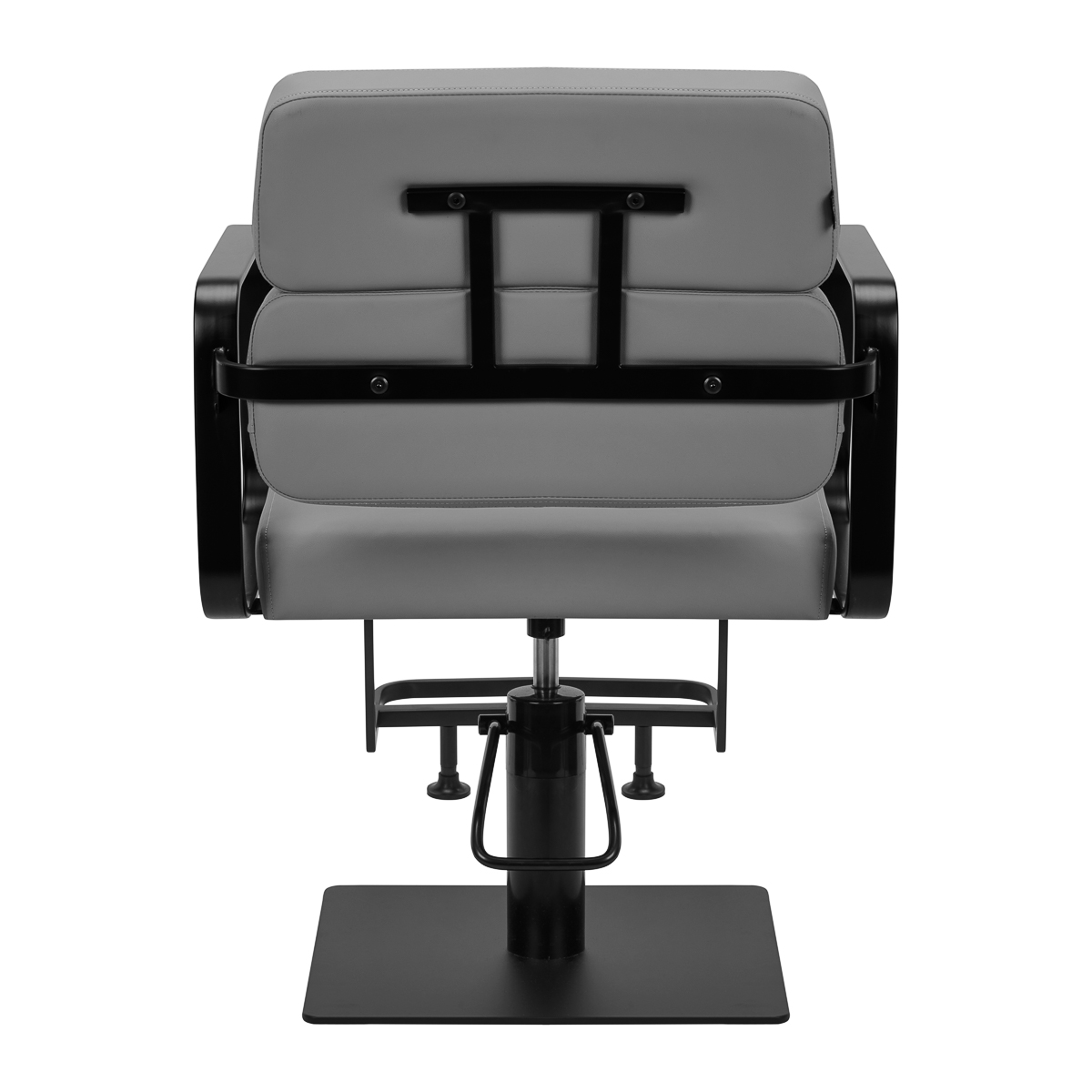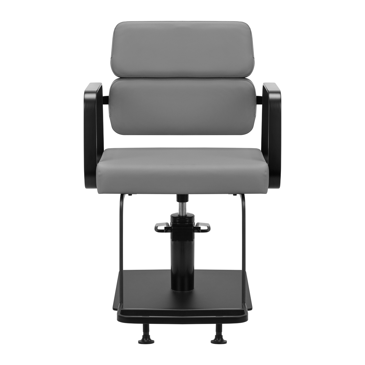 Mechanizm pełnego obrotu, w który jest wyposażony fotel, sprawia, że praca fryzjera staje się bardziej efektywna i wygodna. Solidna, płaska podstawa w kształcie kwadratu gwarantuje stabilność w trakcie użytkowania. Matowo wykończona, gładka powierzchnia nadaje elementowi elegancki wygląd i sprawia, że ten jest łatwy do utrzymania w czystości. Wygodne siedzisko z wypełnieniem z pianki zapewnia wysoki komfort użytkowania, nawet podczas wielogodzinnych zabiegów. Geometryczne, metalowe podłokietniki pozwalają na prawidłowe ułożenie barków klienta – sprawia to, że nie chowa głowy w ramionach ani się nie garbi – co wyraźnie ułatwia wykonywanie precyzyjnych zabiegów, w tym strzyżenia. Dedykowany do tego modelu stylowy podnóżek zapewnia stabilne oparcie dla stóp użytkownika.