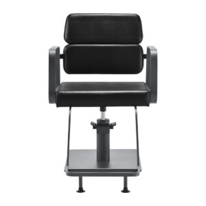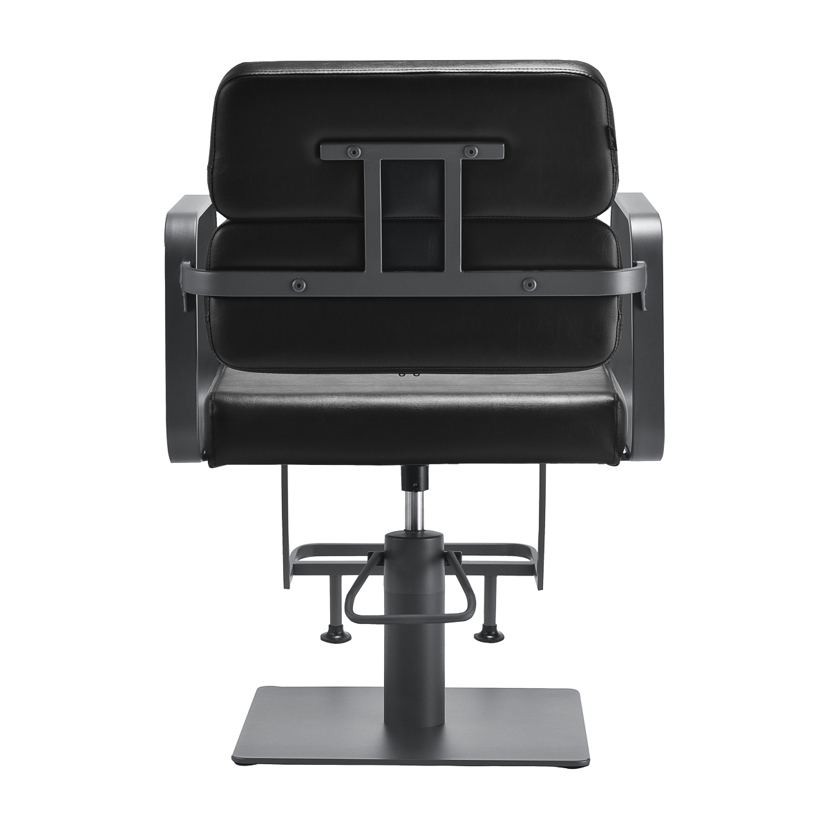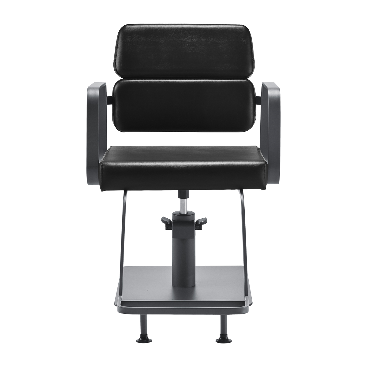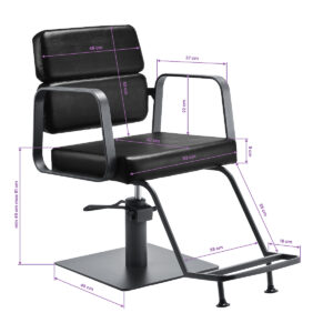 Mechanizm pełnego obrotu, w który jest wyposażony fotel, sprawia, że praca fryzjera staje się bardziej efektywna i wygodna. Solidna, płaska podstawa w kształcie kwadratu gwarantuje stabilność w trakcie użytkowania. Matowo wykończona, gładka powierzchnia nadaje elementowi elegancki wygląd i sprawia, że ten jest łatwy do utrzymania w czystości. Wygodne siedzisko z wypełnieniem z pianki zapewnia wysoki komfort użytkowania, nawet podczas wielogodzinnych zabiegów. Geometryczne, metalowe podłokietniki pozwalają na prawidłowe ułożenie barków klienta – sprawia to, że nie chowa głowy w ramionach ani się nie garbi – co wyraźnie ułatwia wykonywanie precyzyjnych zabiegów, w tym strzyżenia. Dedykowany do tego modelu stylowy podnóżek zapewnia stabilne oparcie dla stóp użytkownika.
