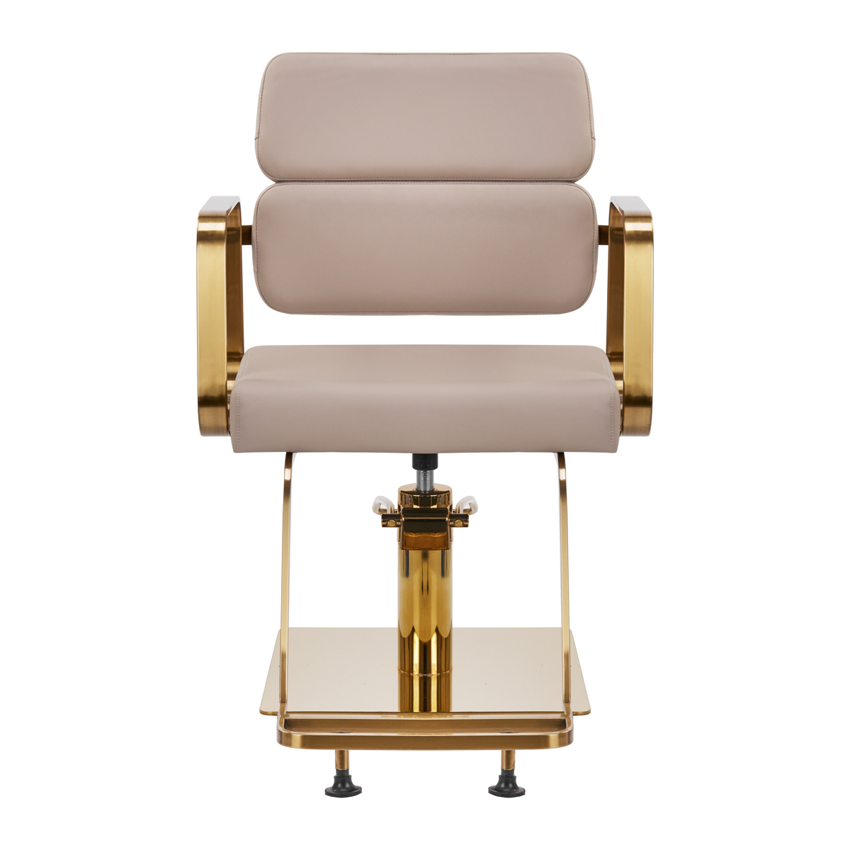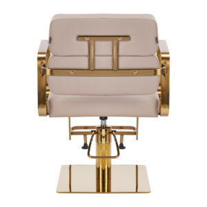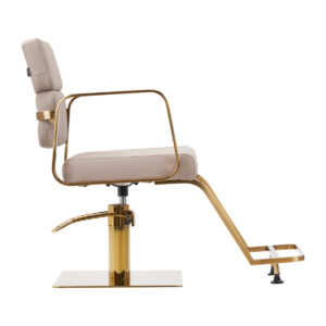 Mechanizm pełnego obrotu, w który jest wyposażony fotel, sprawia, że praca fryzjera staje się bardziej efektywna i wygodna. Solidna, płaska podstawa w kształcie kwadratu gwarantuje stabilność w trakcie użytkowania. Matowo wykończona, gładka powierzchnia nadaje elementowi elegancki wygląd i sprawia, że ten jest łatwy do utrzymania w czystości. Wygodne siedzisko z wypełnieniem z pianki zapewnia wysoki komfort użytkowania, nawet podczas wielogodzinnych zabiegów. Geometryczne, metalowe podłokietniki w odcieniach złota pozwalają na prawidłowe ułożenie barków klienta – sprawia to, że nie chowa głowy w ramionach ani się nie garbi – co wyraźnie ułatwia wykonywanie precyzyjnych zabiegów, w tym strzyżenia. Dedykowany do tego modelu stylowy podnóżek zapewnia stabilne oparcie dla stóp użytkownika.