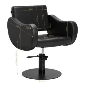 Fotel fryzjerski Gabbiano Sewilla łączy minimalistyczny design z wygodą codziennego użytkowania. Stabilna, okrągła podstawa w matowej czerni nadaje mu elegancki wygląd, a wypełnienie z pianki oraz przyjemna w dotyku skóra syntetyczna w odcieniach czerni z półmatowym wykończeniem zapewniają wysoki komfort. Zastosowane materiały są trwałe, odporne na wilgoć oraz łatwe do utrzymania w czystości. Doskonale sprawdzi się zarówno w nowoczesnych, jak i klasycznych aranżacjach, podkreślając profesjonalny styl wnętrza.