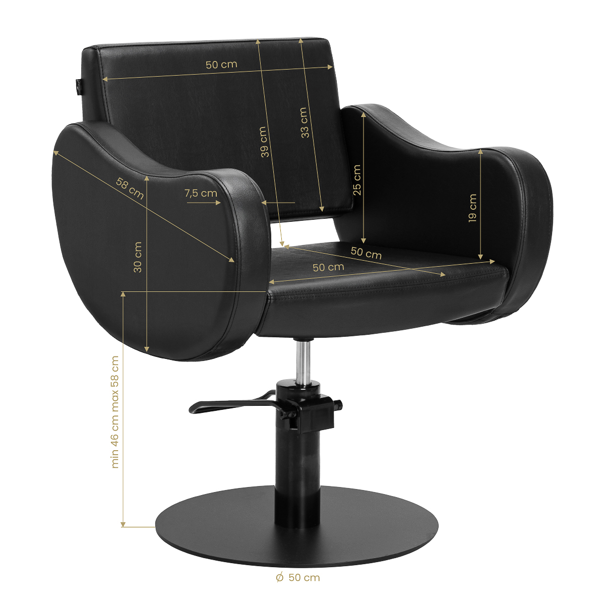 Solidny podnośnik hydrauliczny umożliwia płynną regulację wysokości siedziska w zakresie od 46 do 58 cm – również, gdy klient siedzi na fotelu. To praktyczne rozwiązanie pozwala łatwo dostosować pozycję do wzrostu zarówno klienta, jak i stylisty, wspierając ergonomiczną pracę. Profilowane oparcie zapewnia wygodną pozycję i stabilne podparcie pleców, co ma szczególne znaczenie podczas dłuższych zabiegów. Dodatkowym atutem jest mechanizm pełnego obrotu, który zwiększa swobodę ruchu i ułatwia dostęp do klienta z każdej strony.