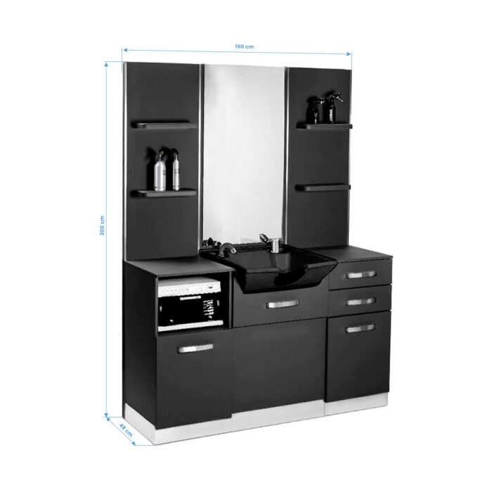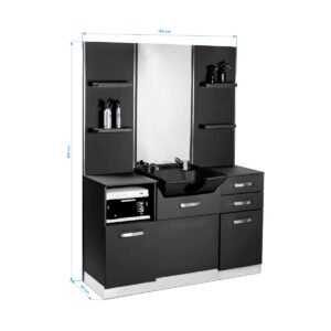 Nowoczesna konsola fryzjerska w kolorze czarnym ze srebrnymi wykończeniami. Duże lustro, czarna umywalka i szuflady zapewniają funkcjonalność, a cały mebel charakteryzuje się wykończeniem najwyższej klasy. Jest to elegancki i jednocześnie uniwersalny element wnętrza, który podkreśli charakter każdego salonu.