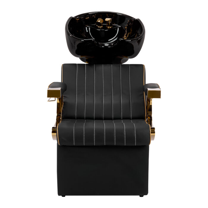 Odpowiednio wyprofilowany fotel wypełniony trwałą pianką zapewnia wsparcie lędźwi, a co za tym idzie wysoki komfort użytkowania. Częściowo tapicerowane, zdobione podłokietniki pozwalają na prawidłowe ułożenie ramion i barków klienta. Pokrycie ze skóry syntetycznej w odcieniach czerni z estetycznymi białymi przeszyciami zapewnia wieloletnią wytrzymałość oraz łatwość czyszczenia. Oryginalny, elegancki wygląd myjni nadaje wnętrzom niepowtarzalnego wyrazu, a ciekawie wyprofilowana podstawa oraz nóżki dodają stabilności. W zestawie znajduje się kompletna armatura w odcieniach złota, w tym bateria, słuchawka prysznicowa oraz dedykowane węże, aby zapewnić całkowity zestaw narzędzi do pracy.
