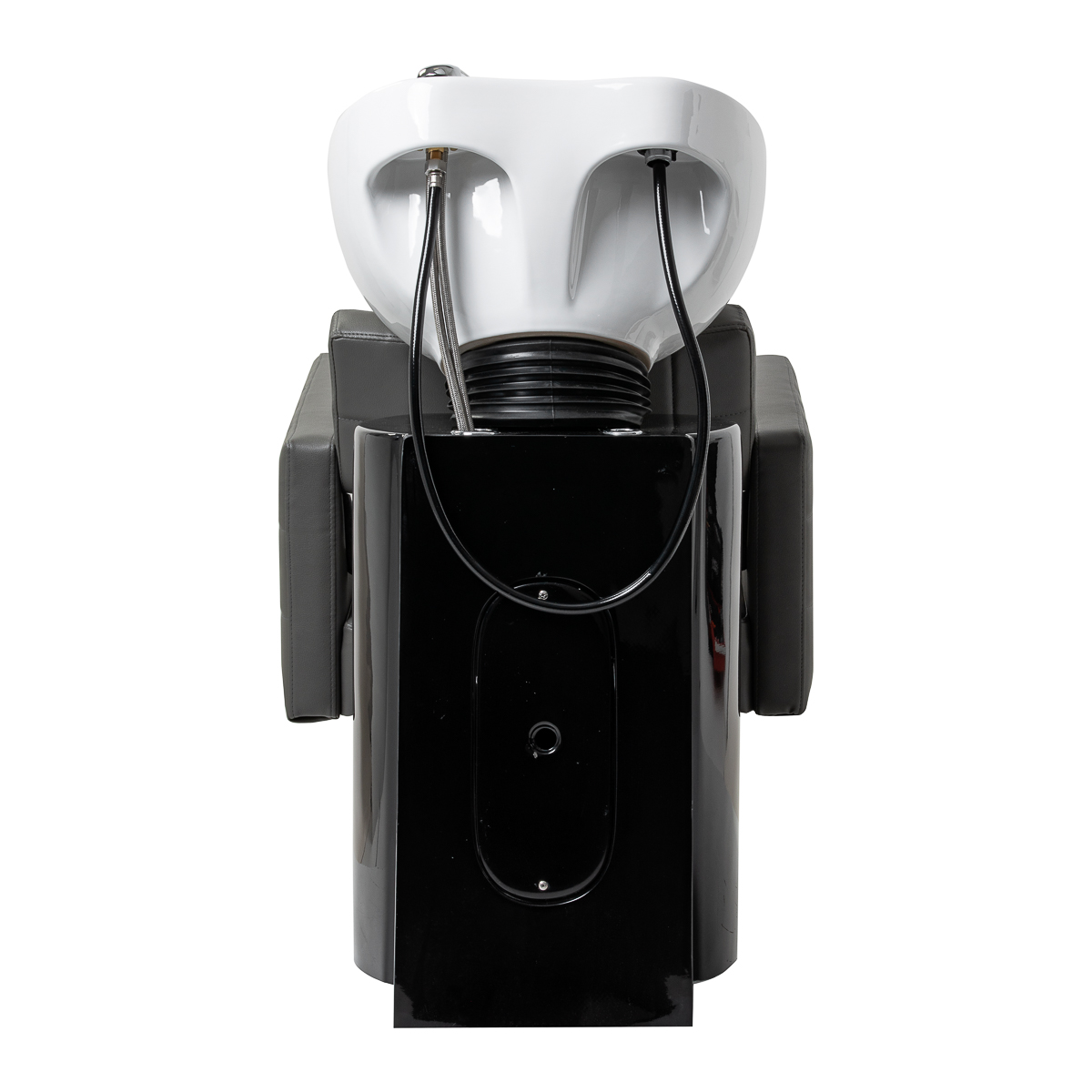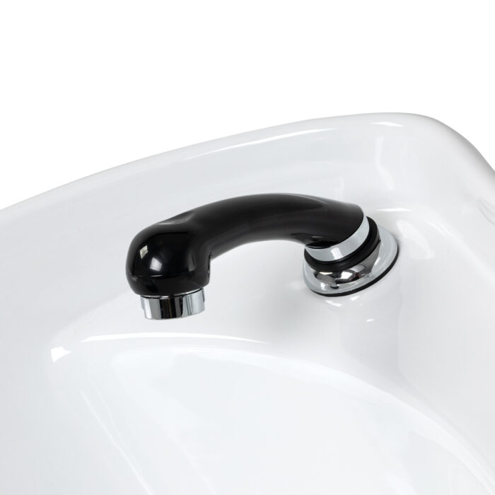 Głęboka ceramiczna misa w odcieniach bieli skutecznie ogranicza rozchlapywanie wody oraz preparatów używanych podczas zabiegów. Sprzyja to komfortowemu i precyzyjnemu wykonywaniu różnorodnych usług fryzjerskich. Ruchoma konstrukcja misy pozwala na łatwe dopasowanie kąta nachylenia do indywidualnych potrzeb. Zastosowany materiał jest trwały, odporny na przebarwienia i zarysowania, a także łatwy w utrzymaniu czystości. Odpowiednio wyprofilowany kołnierz zapewnia wygodne podparcie głowy podczas mycia, natomiast komfortowa nakładka z tworzywa sztucznego w odcieniach czerni eliminuje uczucie chłodu ceramicznej powierzchni.