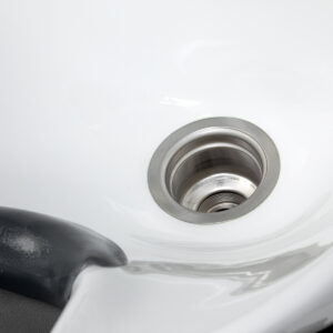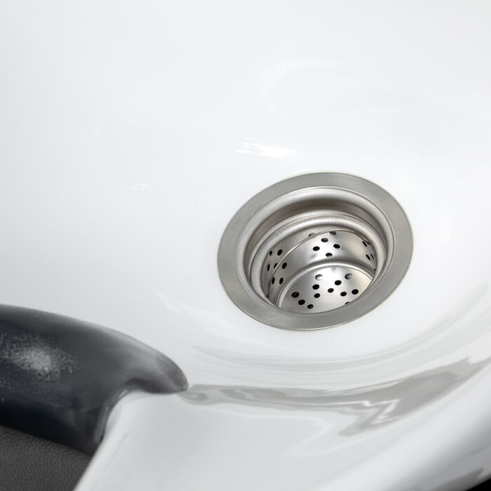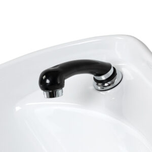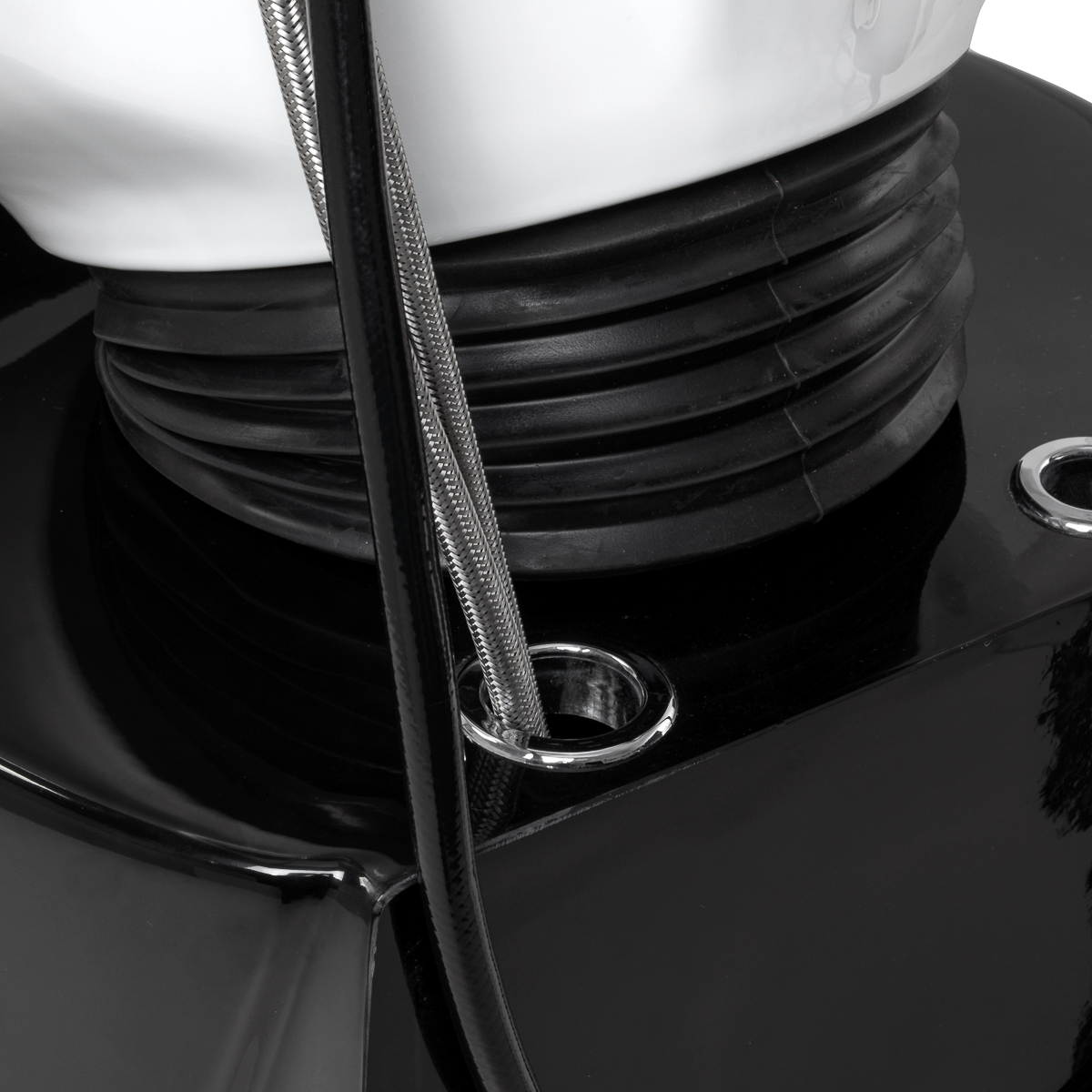 Myjnia została wyposażona w baterię z mieszaczem, która umożliwia wygodne korzystanie z ciepłej i zimnej wody oraz łatwe dopasowanie temperatury do potrzeb klienta. Praktyczne miejsce na odłożenie słuchawki natryskowej ułatwia organizację pracy i pozwala utrzymać porządek na stanowisku. Korek z sitkiem pozwala kontrolować przepływ wody, jednocześnie dbając o zachowanie wysokich standardów higieny. W zestawie znajduje się kompletna armatura – bateria, słuchawka prysznicowa oraz dedykowane węże, które tworzą gotowy zestaw do pracy. Przyłącze wody zostało umieszczone wewnątrz podstawy myjni, co pozwala na estetyczne ukrycie instalacji. W podstawie myjni znajdują się miejsca do przykręcenia jej do podłoża – to rozwiązanie zwiększa stabilność całej konstrukcji. Połączenie funkcjonalnych rozwiązań i przemyślanych detali przekłada się na komfort codziennej pracy w salonie fryzjerskim.