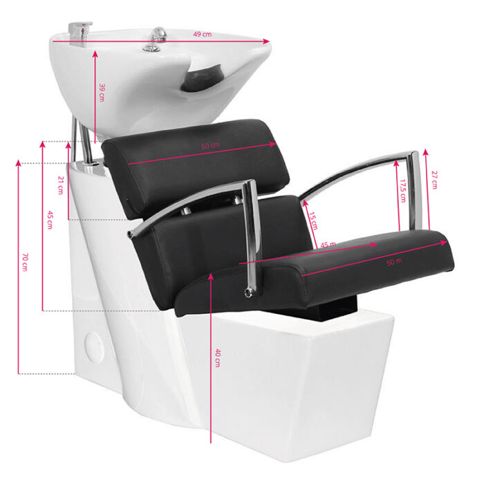 Profesjonalna myjka fryzjerska -stabilna, niezwykle wygodna, solidnie wykonana. Nowoczeny design czyni z niej piękne dopełnienie wyposażenia nowoczesnego salonu fryzjerskiego. Siedzisko wykonane z wysokiej jakości czarnej ekoskóry. Silikonowa podkładka pod głowę stabilizuje głowę klienta i pozwala na jej wygodne ułożenie na myjce. Misa myki w kolorze białym, z możliwości regulacji swojego nachylenia. Myjnia w kolorze czarnym.
