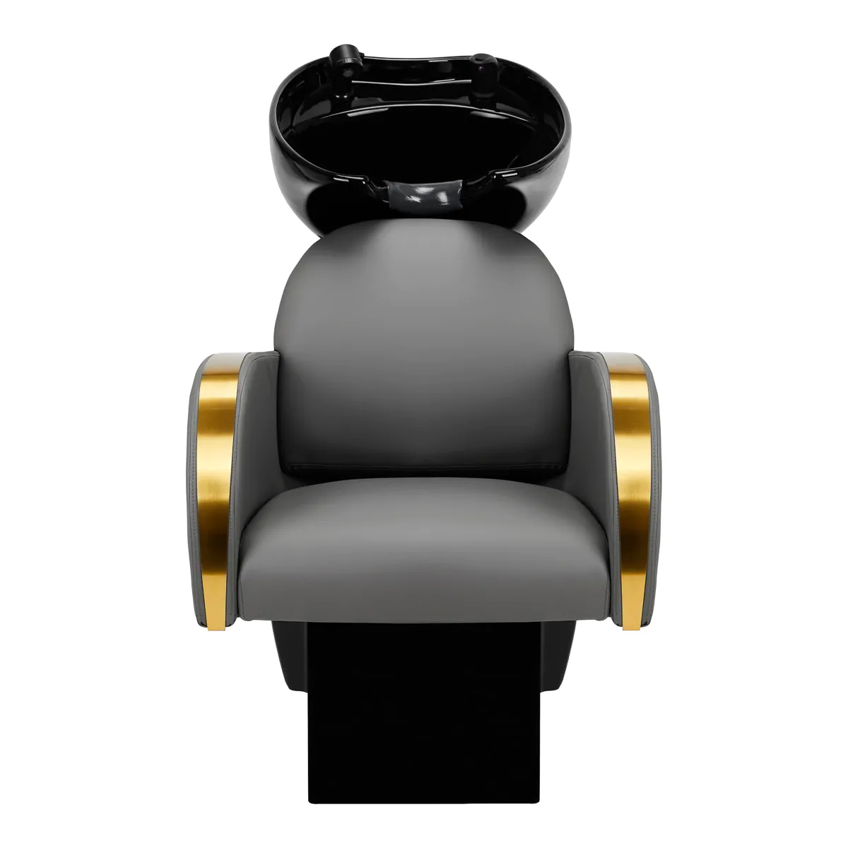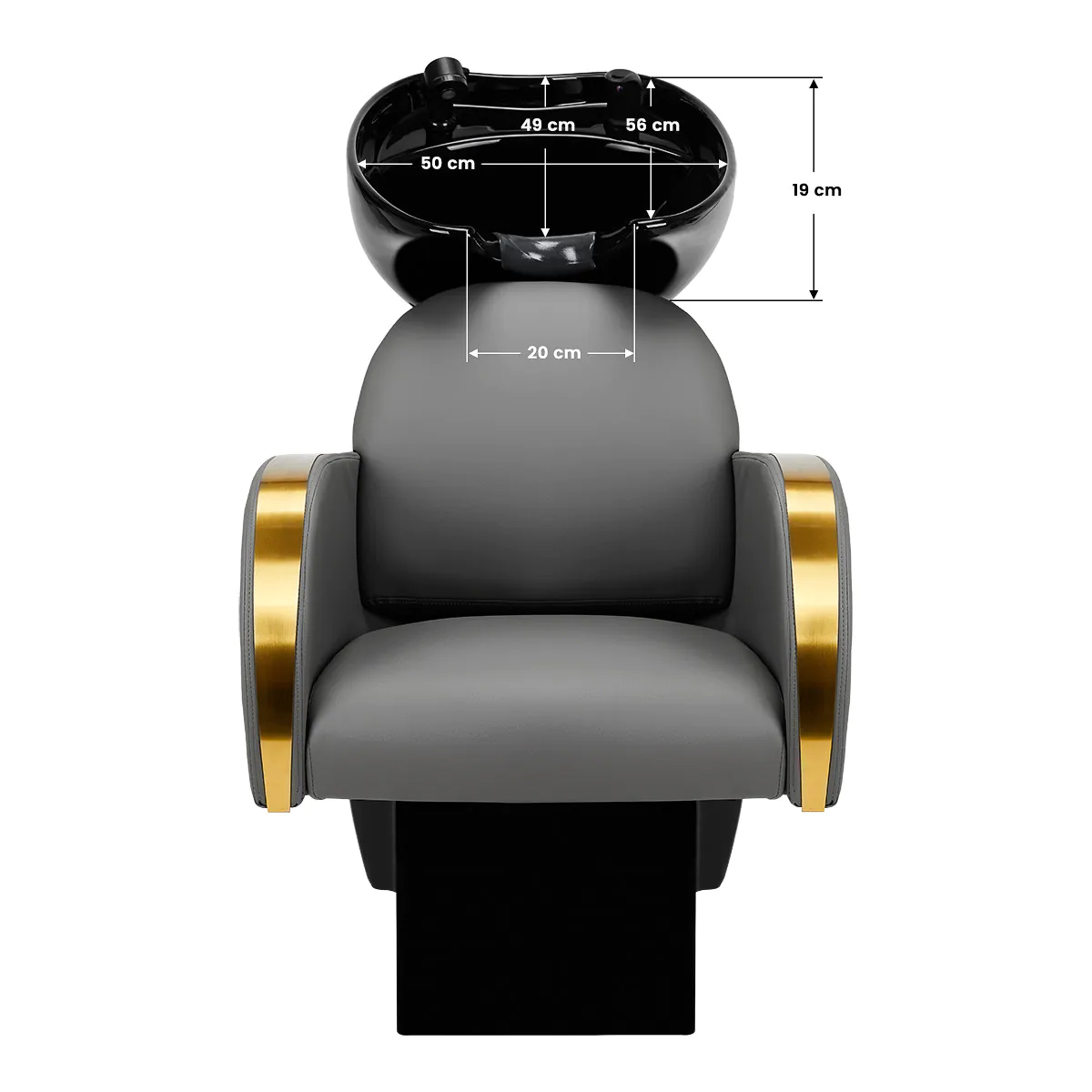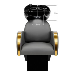 Odpowiednio wyprofilowany fotel wypełniony trwałą pianką zapewnia wysoki komfort użytkowania, a eleganckie podłokietniki pozwalają na prawidłowe ułożenie barków klienta. Oparcie umieszczone pod optymalnym kątem pozwala na zajęcie odpowiedniej pozycji i sprzyja doskonałemu wsparciu kręgosłupa. Pokrycie w odcieniach szarości oraz ozdobne powierzchnie metalowe lakierowane w barwach złota nadają mu wyraz ponadczasowej elegancji, a dodatkowo gwarantują wieloletnią wytrzymałość oraz łatwość czyszczenia. Wyróżniające myjnię klasyczne wykończenie sprawia, że będzie doskonale prezentować się w niemal każdej przestrzeni. W zestawie znajduje się kompletna armatura w odcieniach czerni, w tym bateria, słuchawka prysznicowa oraz dedykowane węże, aby zapewnić całkowity zestaw narzędzi do pracy.