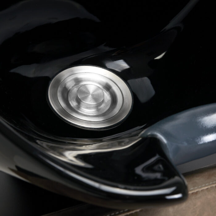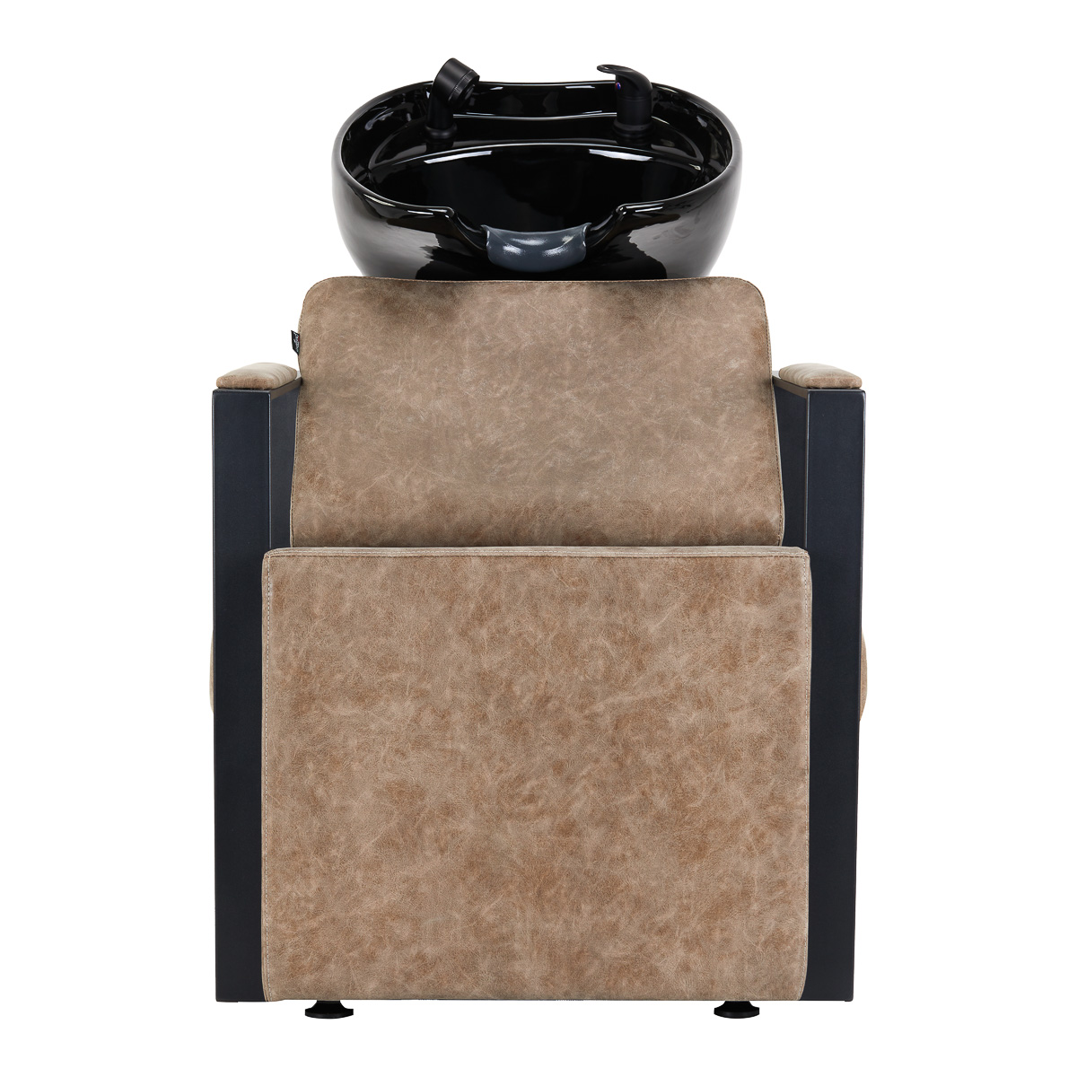 Odpowiednio wyprofilowany fotel wypełniony trwałą pianką zapewnia wysoki komfort użytkowania, a geometryczne, częściowo tapicerowane podłokietniki pozwalają na prawidłowe ułożenie barków klienta. Oparcie umieszczone pod optymalnym kątem sprzyja doskonałemu wsparciu kręgosłupa. Pokrycie ze skóry syntetycznej w odcieniach brązu gwarantuje wieloletnią wytrzymałość oraz łatwość czyszczenia. Oryginalny, elegancki wygląd myjni nadaje wnętrzom niepowtarzalnego wyrazu. Nóżki dodają stabilności i subtelnie podkreślają stylowy charakter myjni. W zestawie znajduje się kompletna armatura o matowym wykończeniu w odcieniach czerni, w tym bateria, słuchawka prysznicowa oraz dedykowane węże, aby zapewnić całkowity zestaw narzędzi do pracy.