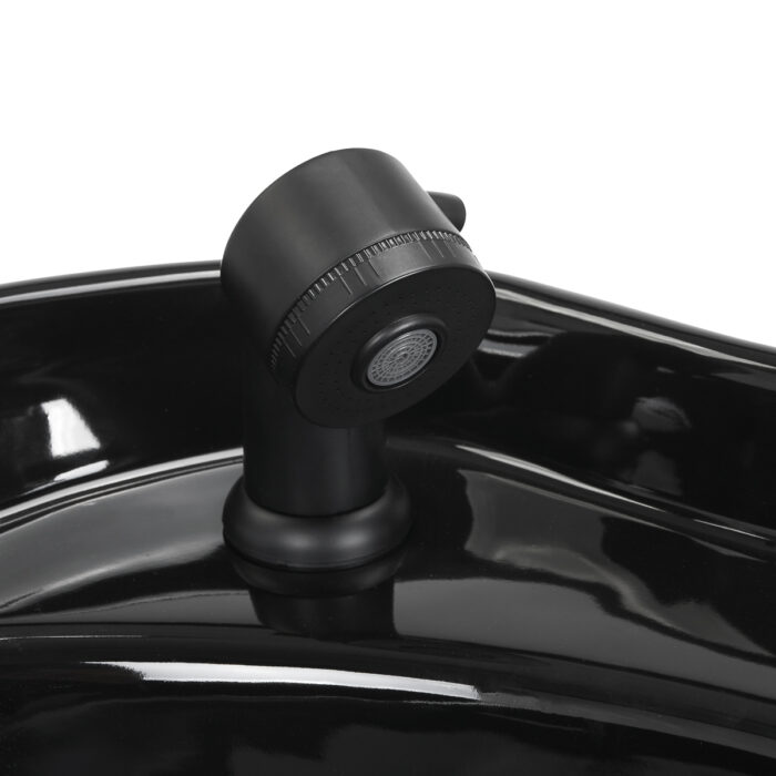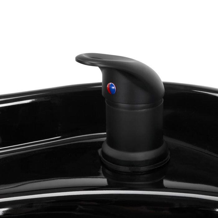 Głębokość ceramicznej misy umywalki w odcieniach czerni zapobiega nadmiernemu rozchlapywaniu wody oraz używanych w trakcie zabiegu produktów. Pozwala to na komfortowe i efektywne wykonywanie szerokiej gamy usług fryzjerskich. Ruchomość misy umożliwia łatwe dopasowanie kąta jej nachylenia do indywidualnych potrzeb. Zastosowany materiał sprawia, że umywalka jest wytrzymała, odporna na przebarwienia i zadrapania oraz bardzo łatwa do utrzymania w czystości. Odpowiednio wyprofilowany kołnierz zapewnia optymalne wsparcie oraz wygodę w trakcie mycia włosów, a komfortowa nakładka z tworzywa sztucznego w odcieniach czerni sprawia, że klient nie odczuje nieprzyjemności związanych z chłodem ceramicznej powierzchni.
