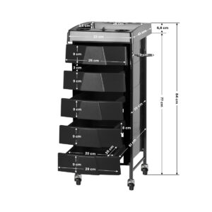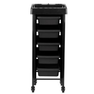 Pomocnik fryzjerski dwustronny w kolorze czarnym ,posiada 5 kuwet,7 schowków i 2 uchwyty na asortyment fryzjerski. Stablina konstrukcja zapewni długotrwałe użytkowanie. Stolik osadzony na gumowanych kółkach, dzięki którym narzędzia będą zawsze pod ręką.