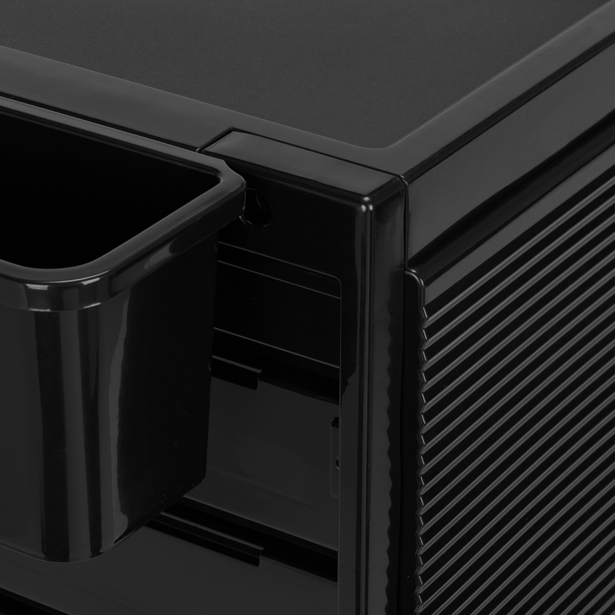 Na wierzchu pomocnika znajduje się płytkie wgłębienie, które świetnie sprawdzi się do odkładania narzędzi w trakcie pracy. Będzie również doskonałym miejscem na umieszczenie najbardziej potrzebnych przyborów na czas usługi – jak przy koloryzacji – misek, farb czy pędzli. Powierzchnia wgłębienia – podobnie jak wszystkich kuwet w zestawie – pokryta jest matową, chropowatą, antypoślizgową warstwą, dzięki czemu amortyzuje i utrzymuje odłożone przyrządy w danym miejscu.