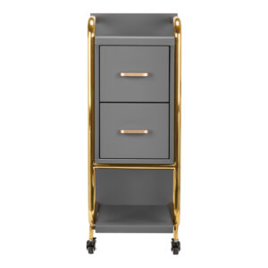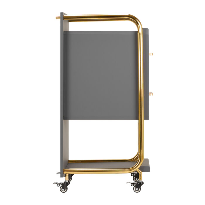 Wysokiej jakości pomocnik fryzjerski Gabbiano Solo to elegancki element wyposażenia, który znacząco usprawnia pracę w salonie fryzjerskim. Dwie pojemne szuflady oraz dwie różnej wielkości półki znacząco ułatwiają organizację produktów i niezbędnych narzędzi. Gumowane kółka z hamulcami zapewniają odpowiednią mobilność, co pozwala na swobodne ustawianie mebla w dowolnym miejscu salonu. Elegancki design – polerowane metalowe elementy w odcieniach złota oraz stabilna konstrukcja z drewnianych płyt w odcieniach szarości – doskonale podkreśli charakter wnętrz.