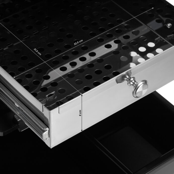 Pojemny organizer wyposażony jest w zestaw kuwet, które pomogą zadbać o porządek w miejscu pracy, posegregować odpowiednio niezbędne w pracy fryzjera przybory. W zestawie znajduje się sześć pojemników: dwa bez przegródek, dwa z przegródkami oraz dwa wąskie i głębsze. Ich układ w organizerze można dowolnie zmieniać, dopasowując go do własnych potrzeb, a znaczny wybór różnych typów szuflad pozwala na posegregowanie przyborów według uznania. Dodatkowo dwie najgłębsze kuwety można umieszczać na różnych wysokościach po bokach pomocnika, dzięki czemu ułożone w nich przybory zawsze znajdą się na odpowiednim poziomie. Zabudowany tył zabezpiecza szuflady przed przypadkowym ich wysunięciem w drugą stronę, co mogłoby skutkować uszkodzeniem znajdujących się w nich przyborów.