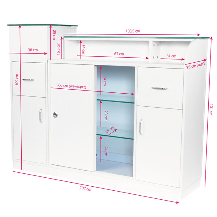 Recepcja -wizytówka salonu. To tutaj na początku trafia każdy nowy klient. Dobrze wiemy jak ważne jest pierwsze wrażenie. Warto o nie zadbać i sprawić, żeby każdy odwiedzający nasz salon poczuł atmosferę luksusu. Przedstawimy nową recepcję marki Gabbiano. Mebel jest wykonany z najwyższej jakości materiałów i doskonale wykończony. W jego wewnętrznej części znajdują się szafki i szuflady oraz dostep do środkowej wytryny. Dzięki temu recepcja jest bardzo pojemna i umozliwia zachowanie porządku w miejscu, w którym zgromadzone są wszytkie ważne dokumenty.