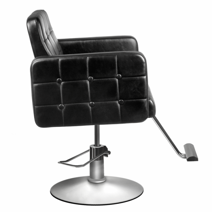 Klaszyczny fotel fryzjerski marki HAIR SYSTEM. Elagancki i bardzo wygodny. Solidna, chromowana podstawa gwarantuje utrzymanie stabilności siedziska. Obicie wykonane z wysokiej jakości czarnej ekoskóry. Fotel posiada regulację góra-dół.