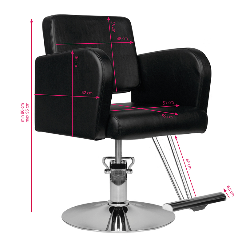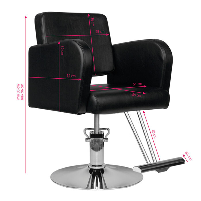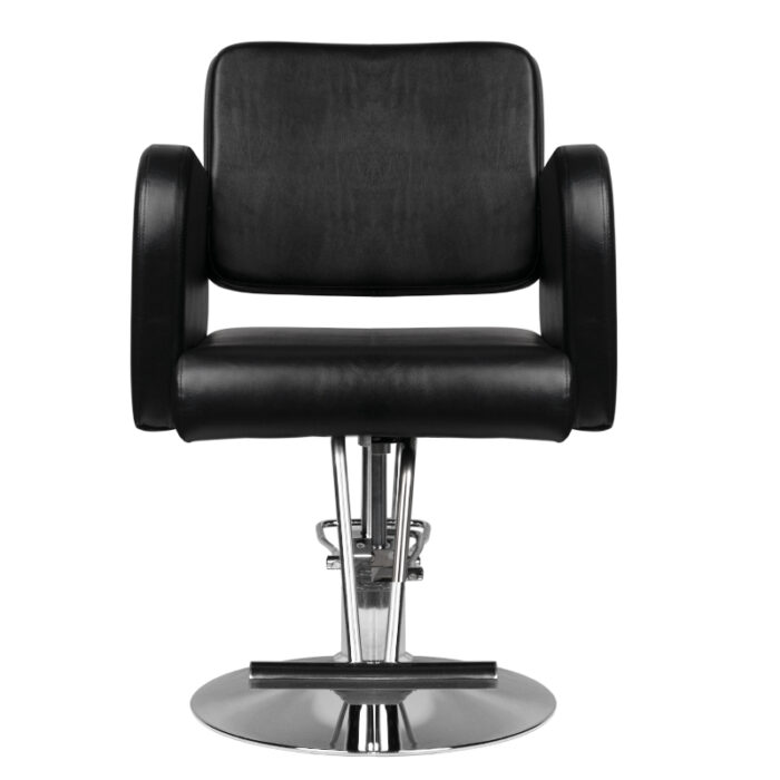 Nowoczesny fotel fryzjerski marki HAIR SYSTEM. Elagancki i bardzo wygodny. Solidna, chromowana podstawa gwarantuje utrzymanie stabilności siedziska. Obicie wykonane z wysokiej jakości czarnej ekoskóry. Fotel posiada regulację góra-dół.