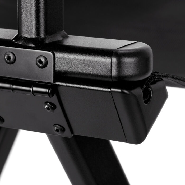 Krzesło posiada system blokady, dzięki czemu w trakcie użytkowania zapewnia stabilność. Po odblokowaniu w łatwy sposób można je złożyć, co znacznie ułatwia przechowywanie oraz transport. Minimalistyczne podłokietniki oraz podnóżek o szerokości niemal 40 cm zapewniają użytkownikowi wygodę i komfort w trakcie wykonywania makijażu czy charakteryzacji. Wraz z oparciem pozwalają one zająć odpowiednią pozycję, co ma znaczenie zwłaszcza w trakcie dłuższych zabiegów. Zastosowane rozwiązania sprawiają, że krzesło jest niezwykle praktyczne, daje mnóstwo przestrzeni do pracy osobom oferującym usługi mobilne i sprawdzi się w nawet najbardziej nietypowych warunkach.