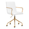 Przyjemne w dotyku, obicie ze skóry syntetycznej w odcieniach bieli nadaje meblowi wyjątkowego charakteru. Eleganckie wykończenie sprawia, że mebel przykuwa wzrok. Stelaż w odcieniach złota dodaje elegancji, idealnie komponując się z prostymi kształtami. Funkcjonalne kółka zapewniają znaczną mobilność, ułatwiając przestawianie krzesła oraz poruszanie się po salonie w trakcie pracy. Estetyka wykonania, komfort użytkowania oraz ergonomicznie wyprofilowane oparcie sprawiają, że krzesło spełni wymagania nawet najbardziej wymagających użytkowników.