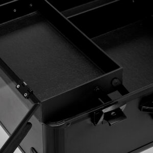 Funkcjonalny kufer kosmetyczny w formie wygodnej, przenośnej walizeczki na kółkach. Idealne rozwiązanie dla mobilnych kosmetyczek czy wizażystek. Bardzo pojemny. Posiada cztery teleskopowe nogi, dzięki którym możemy odpowiednio wyregulowac wysokość stanowiska. Po bokach lustra oświatlenie. Wewnatrz kuferka dodatkowo cztery składane półeczki na drobne akcesoria. Kolor czarny.
