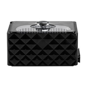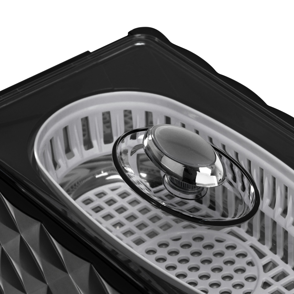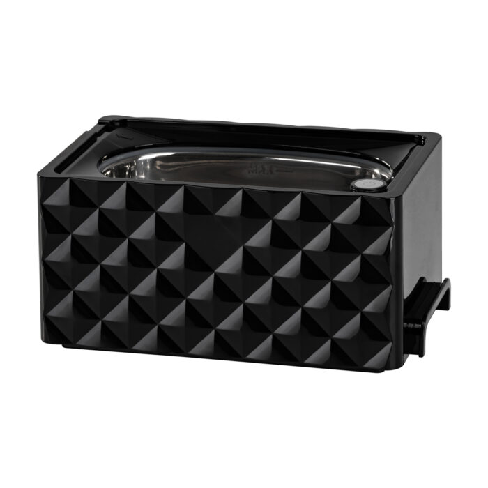 Niewielkie gabaryty sprawiają, że ta myjka ultradźwiękowa jest bardzo prosta w transporcie, a dodatkowo nie zajmuje zbyt wiele miejsca w salonie. Estetyczna, zdobiona obudowa wykonana jest z tworzywa sztucznego w odcieniach czerni, a przejrzysta pokrywa pozwala na bieżąco obserwować przebieg procesu i nie utrudnia włączenia urządzenia, mimo że guzik ukryty jest pod nią. Pojemnik ma we wnętrzu oznaczenie maksymalnego napełnienia płynem (do 300 ml). Stabilność urządzenia zapewniają antypoślizgowe stopki.