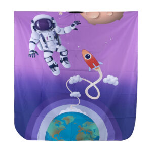 Peleryna wykonana jest z wodoodpornego materiału, który łatwo utrzymać w czystości i który nie przepuszcza wilgoci, chroniąc ubrania przed zamoczeniem. Regulowane, komfortowe zapięcie umożliwia idealne dopasowanie. Wymiary oraz niezwykle proste składanie znacznie ułatwiają przechowywanie. Dodatkowo, wesoły nadruk z kosmicznymi elementami sprawia, że peleryna staje się nie tylko praktycznym akcesorium, ale także ciekawą atrakcją, umilającą wizytę u fryzjera.