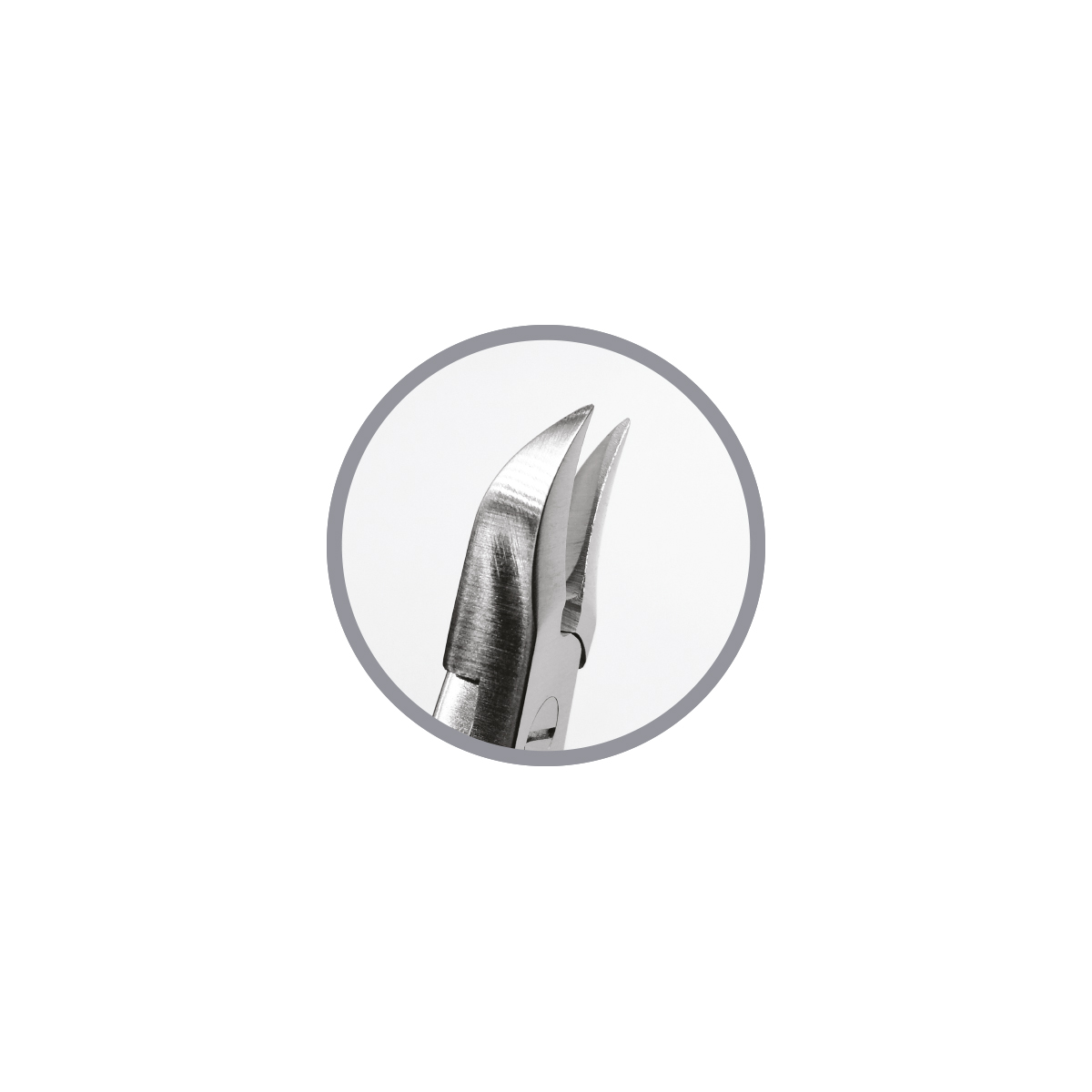 Cęgi z zakrzywionym ostrzem (boczne) zostały wykonane z najwyższej jakości stali nierdzewnej. To wytrzymałe i precyzyjne narzędzie z ostrą powierzchnią tnącą (1,6 cm). Specjalna konstrukcja ostrza powoduje, że cęgi znakomicie sprawdzają się do skracania paznokci w kształcie półokrągłym. Model jest wyposażony w zabezpieczony dwusprężynowy mechanizm. Narzędzie może być sterylizowane w autoklawie. Cęgi są polecane zwłaszcza do stosowania w gabinetach kosmetycznych i podologicznych.