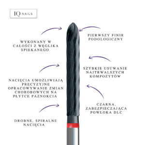 Dodatkowo ostrość oraz głębokość nacięć umożliwia szybkie i precyzyjne opracowywanie powierzchni zarówno materiału jak i zmian chorobowych w obrębie płytki paznokci.