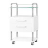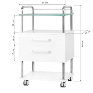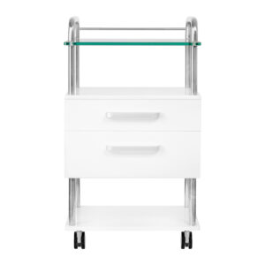 Wysokiej jakości pomocnik podologiczny to funkcjonalny mebel kosmetyczny na kółkach. Dzięki swojej mobilności możesz transportować go do innych pomieszczeń zabiegowych. Pomocnik posiada szklany blat roboczy, dwie szuflady na narzędzia, akcesoria oraz półkę na frezarkę podologiczną lub inne urządzenie.
