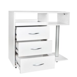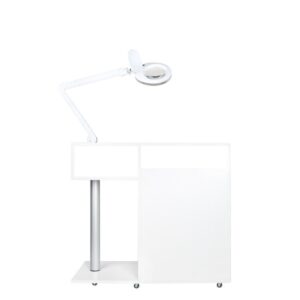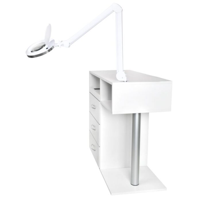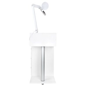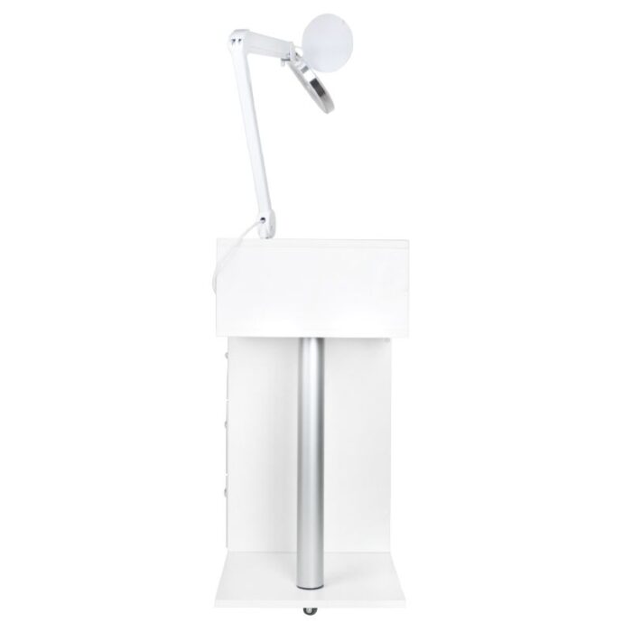 Profesjonalny unit podologiczny, solidnie wykonany z szufladami wraz ze specjalną szufladą na sterylizator UV-C oraz półką na frezarkę. Dopełnieniem całości jest uchwyt na lampe lupę TUBE a metalowo-gumowe kółka gwarantują mobilność. Pomocnik został stworzony aby ułatwić pracę osobie wykonującej zabieg.