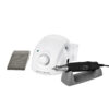 Dołączone do zestawu akcesoria zapewniają bezpieczeństwo oraz wygodę korzystania. Frezarka wyposażona jest w napęd nożny, umożliwiający precyzyjne kontrolowanie pracy głowicy i swobodną, komfortową pracę, dzięki możliwości sterowania urządzeniem bez użycia rąk. W trakcie pracy głowicę bezpiecznie można odłożyć na dołączony do zestawu dedykowany silikonowy stojak lub odwiesić dzięki wygodnemu plastikowemu uchwytowi, który można zamontować po obu stronach urządzenia. Miejsce na frezy na obudowie pozwala na przygotowanie niezbędnych narzędzi, by mieć je pod ręką w trakcie pracy.