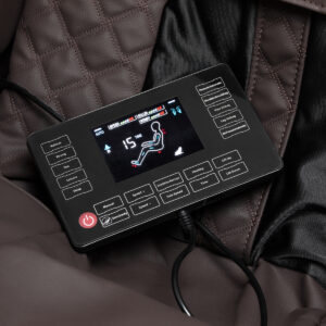 Przejrzysty panel sterowania z ekranem LCD zapewnia łatwą i intuicyjną obsługę fotela. Panel można wygodnie umieścić na uchwycie zamontowanym na prawym podłokietniku lub trzymać w dłoniach. Wyrazisty wyświetlacz pokazuje bieżącą pracę urządzenia, w tym masowane obszary ciała, intensywność masażu, czas zabiegu oraz wybrany program. Panel umożliwia precyzyjne dostosowanie ustawień fotela i funkcji masażu, a także wybór długości sesji, która może trwać 5, 10, 15, 20, 25 lub 30 minut.