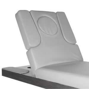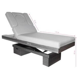 Nowa leżanka kosmetyczna. Absolutny hit wśrod leżanek. Elektryczna regulacja wysokości w bardzo szerokim zakresie 62-90 cm. Oparcie również regulowane za pomocą pilota, od pozycji poziomej do niemal pionu (podnosi się do 80 stopni). W oparciu otwór z jedną wkładką – całkiem wypełniającą. Możliwość wysunięcia w bok bądź całkowitego demontażu części bocznych oparcia. W dolnej cześci, pod oparciem, znajduje się szufladka na podręczne akcesoria. Mebel szeroki (76 cm), z grubym, podgrzewanym i bardzo wygodnym materacem. Leżanka jest bardzo stabilna. Posiada obicie z wysokiej jakości ekoskóry.
