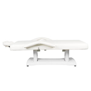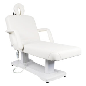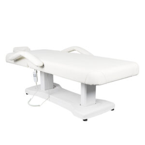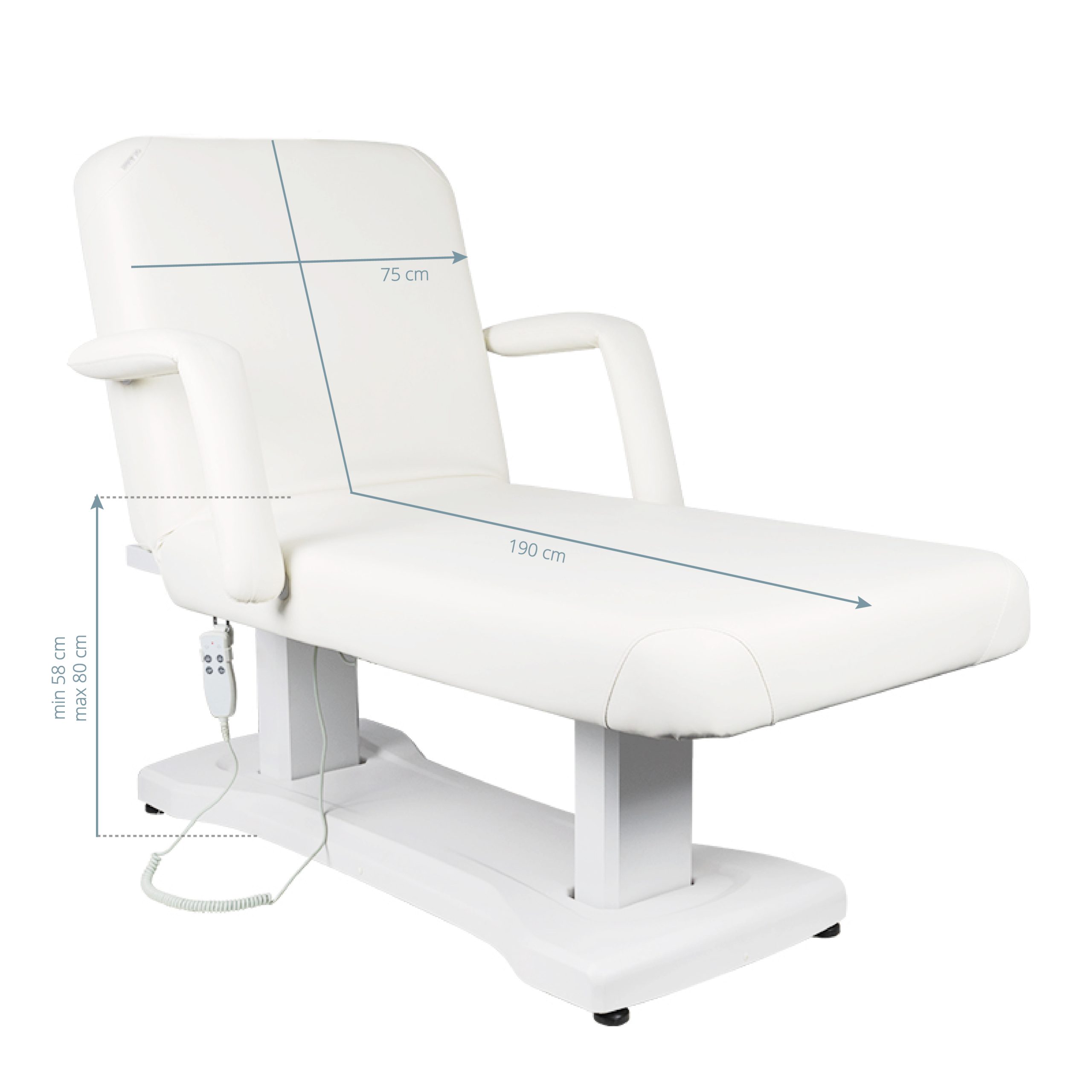 Leżanka kosmetyczna elektryczna regulowana wysokość w bardzo szerokim zakresie od 58 do aż 80 cm. Oparcie, oraz wysokość regulowane są za pomocą pilota. Do oparcia dołaczany jest zagłówek z otworem na twarz. Mebel szeroki (75 cm), z grubym i bardzo wygodnym materacem. Leżnka jest bardzo stabilna. Posiada obicie z wysokiej jakości ekoskóry.
