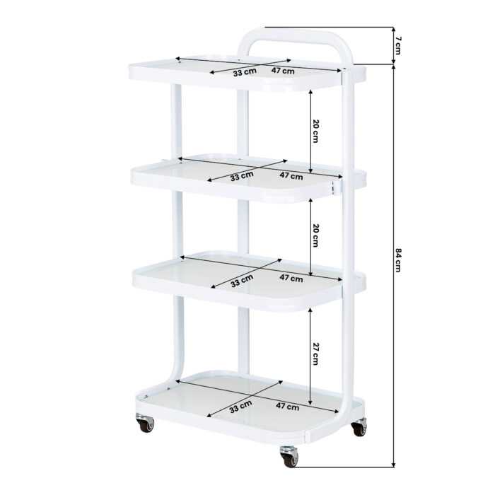 Prosta konstrukcja, stelaż z trwałego aluminium w odcieniach bieli oraz szklane półki sprawiają, że stolik jest zarówno estetyczny, jak i łatwy do utrzymania w czystości. Cztery kółka pozwalają na swobodne przestawianie, co znacząco ułatwia pracę w salonie, a solidne materiały gwarantują długotrwałą wytrzymałość i stabilność. Eleganckie wykończenie dodaje mu wyjątkowego wyglądu, podnosząc estetykę każdego wnętrza.