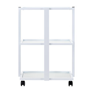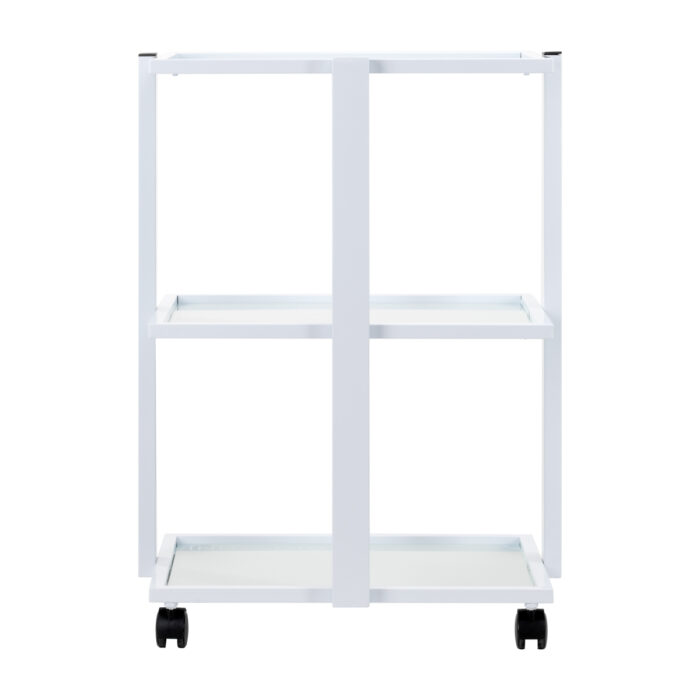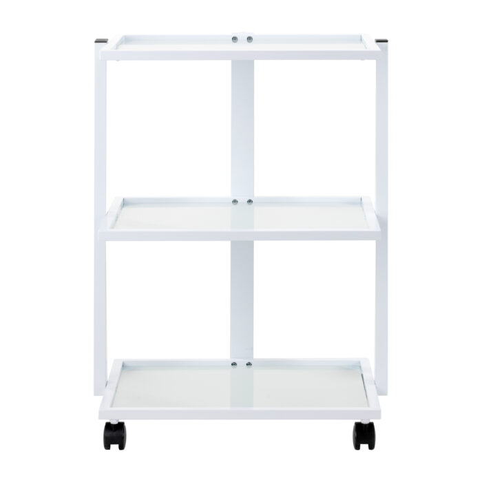 Prosta konstrukcja, stelaż z trwałego aluminium w odcieniach bieli oraz szklane półki łączą elegancję z praktycznością, zapewniając wytrzymałość i stabilność mebla. Gładkie powierzchnie ułatwiają utrzymanie stolika w czystości, a cztery kółka umożliwiają jego swobodne przestawianie, co zwiększa komfort pracy w salonie. Eleganckie wykończenie podkreśla profesjonalny charakter wnętrza. Na ramie stolika znajduje się specjalne miejsce, umożliwiające prosty montaż profesjonalnej lampy-lupy.
