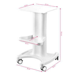 Funkcjonalny plastikowy stolik z gumowymi kółkami z funkcją blokady. Iidealnie sprawdza się jako stolik pod urządzenie kosmetyczne. Posiada dwie półki, jedna na urządzenie, druga na akcesoria. Mebel zapewnia wygodę i komfort podczas pracy.