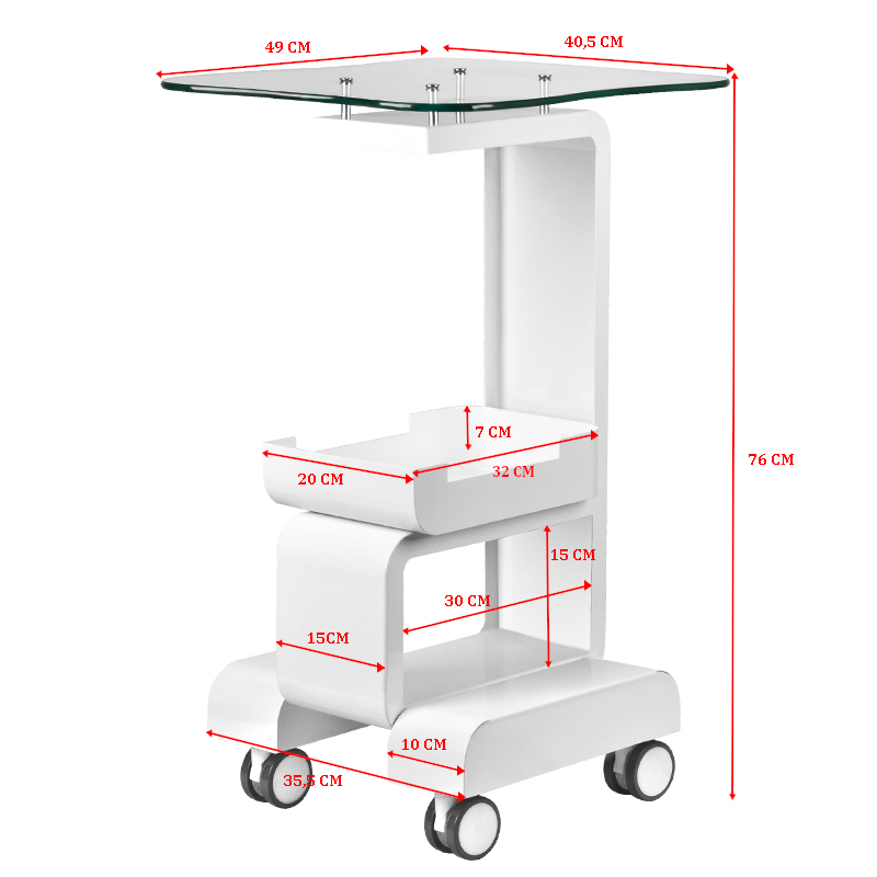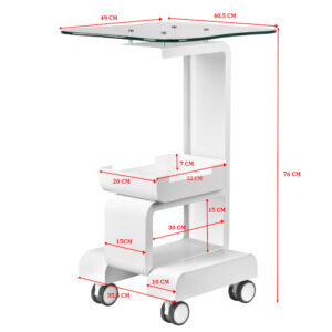 Funkcjonalny, metalowo-szklany stolik z gumowymi kółkami z funkcją blokady. Iidealnie sprawdza się jako stolik pod urządzenie kosmetyczne. Posiada stabilną półkę na urządzenie oraz drugą na akcesoria a dzięki kółką stolik jest mobilny i łatwy do przesuwania. Mebel zapewnia wygodę i komfort podczas pracy