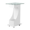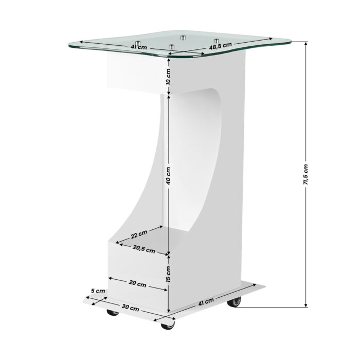 Funkcjonalny, metalowo-szklany stolik z gumowymi kółkami z funkcją blokady. Iidealnie sprawdza się jako stolik pod urządzenie kosmetyczne. Posiada stabilną półkę na urządzenie a dzięki kółką stolik jest mobilny i łatwy do przesuwania. Mebel zapewnia wygodę i komfort podczas pracy