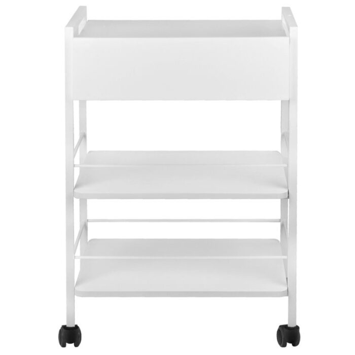 Estetyczny i funkcjonalny metalowo drewniany stolik firmy GIOVANNI, z jedną drewnianą szufladą zamykaną na kluczyk i dwiema drewnianymi półeczkami. Górna część szuflady dodatkowo spełnia rolę półki. Stolik posiada cztery kółka. Stolik dostępny w kolorze białym.