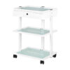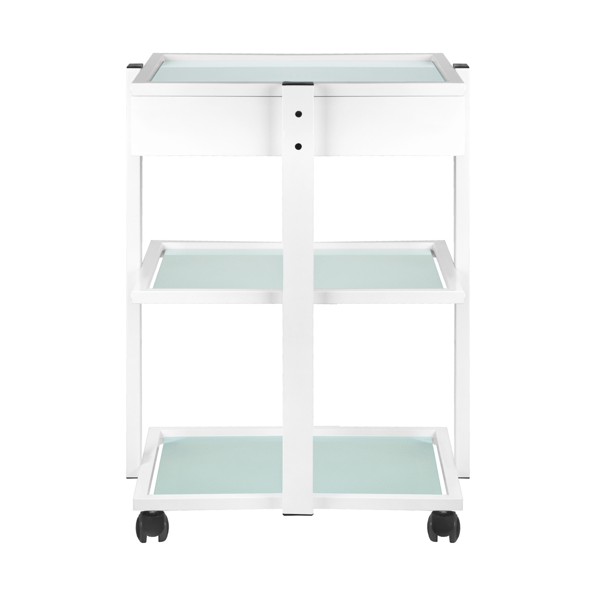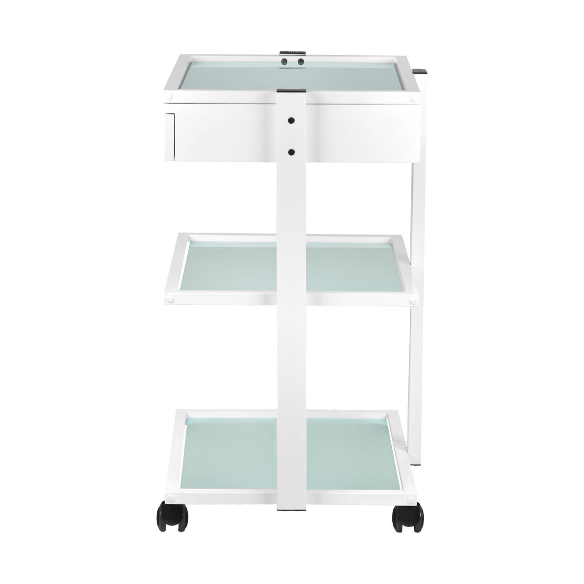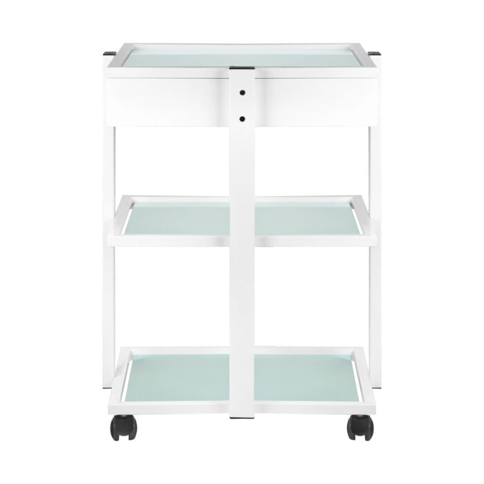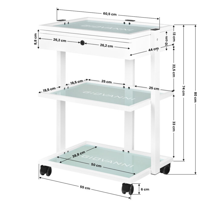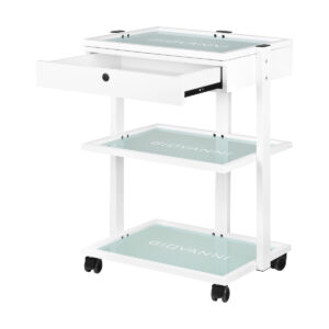 Elegancki metalowo-szklany stolik, na gumowych kółkach. Stolik posiada pojemną szufladę i dwie szklane półki z grawerowanym logo firmy GIOVANNI. Istnieje możliwośc przymocowania do stolika lampy-lupy.