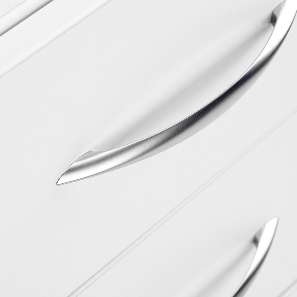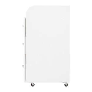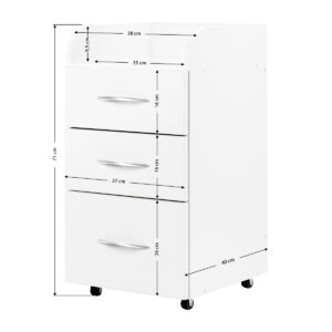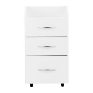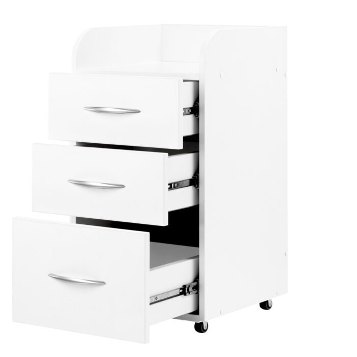 Szafka z 3 szufladami na prowadnicach rolkowych kolorze białym. Szafka ma zainstalowane kółka, co umożliwia łatwe przesuwanie jej po podłodze.