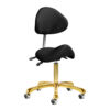 Pięcioramienna, odpowiednio zaprojektowana podstawa w odcieniach złota sprawia, że taboret jest stabilny, nawet podczas intensywnej pracy. Kółka zapewniają znaczną mobilność, co ułatwia przemieszczanie mebla po gabinecie. Obicie wytrzymałego taboretu wykonano z imitacji skóry w odcieniach czerni. Dzięki użyciu takiego materiału taboret jest odporny na wilgoć i łatwy w czyszczeniu.