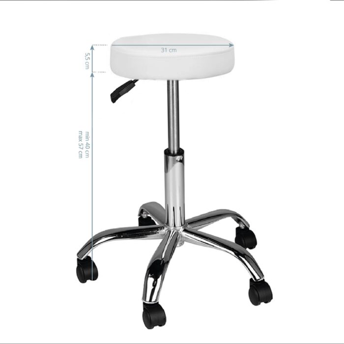 Wygodny taboret kosmetyczny, stabilny na pięcioramiennej podstawie, bez oparcia, w kolorze białym, niezbędny mebel w gabinecie kosmetycznym.